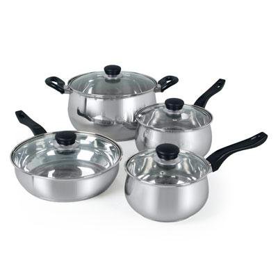 Oster Rametto 8-piece Cookware set with belly construction; mirror & semi-mirror finish; bakelite handles includes 2qt Covered Sauce Pan, 3qt Covered Sauce Pan, 7qt Dutch Oven with Lid, 3qt Covered Saute Pan with Lid. Stainless steel.