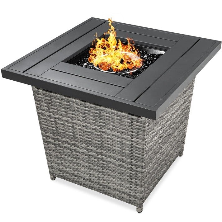 50,000 BTU Grey Wicker LP Gas Propane Fire Pit w/ Faux Wood Tabletop and Cover