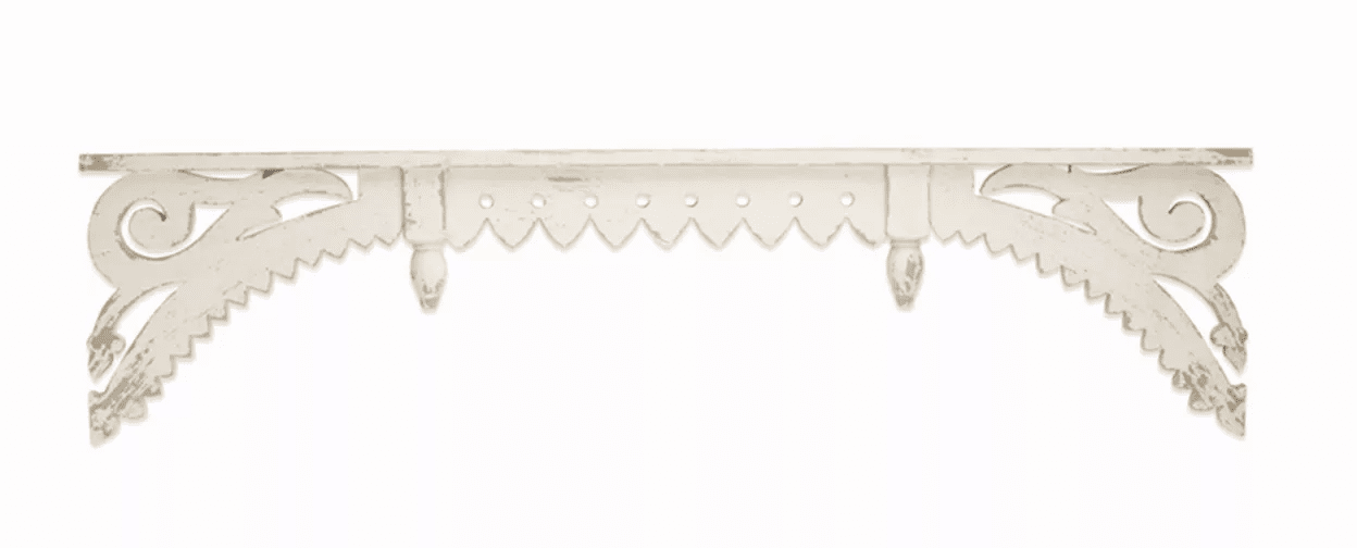 Timeworn character with modern functionality Weathered and distressed 23"x12"H Like rare antique architectural salvage retrofitted into a shelf, this piece blends timeworn character with modern functionality. Weathered and distressed to show hints of the wood grain.