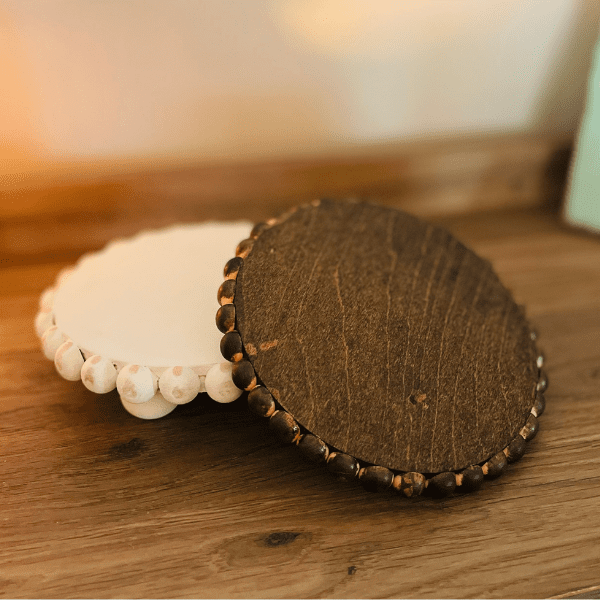 Our Farmhouse White and Dark Wood Round Beaded Riser is perfect on any surface to display your trinkets, candles, or garland beads. Slightly distressed with a round top, embellished with half cut beads. Diameter 5 1/2 inches, Height 1 3/8 inches.
