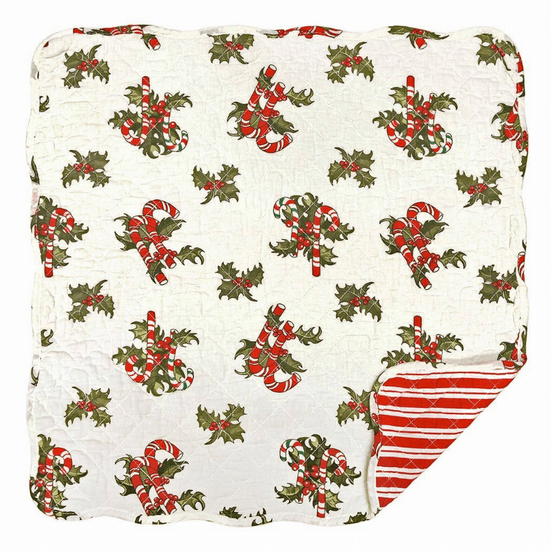Candy cane table topper. All quilts and accessory pieces are made from 100% pre-washed cotton and are machine stitched and machine washable