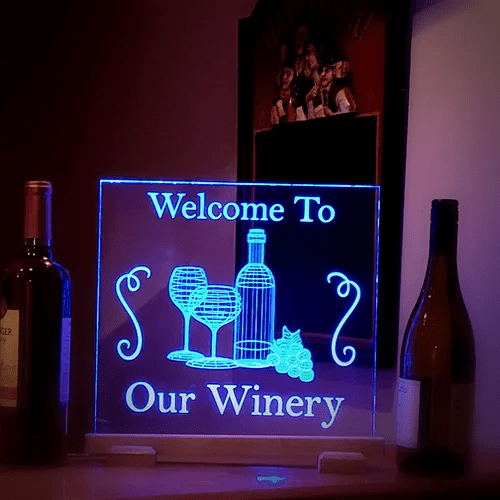 Welcome to our Winery - Here's a beautiful wine lovers LED sign, shown in hanging mode or tabletop mode. It measures 12" x 12", and has full controls to select color, brightness, and display mode, including Fade (auto change from one color to the next). It is powered by a USB source, and comes with the light controls built into the USB cable. The tabletop version comes with two solid wood stands that the base fits into. The hanging version comes with eye hooks installed in the top, along with a 16" chain, or you can use your own chain if you prefer.
