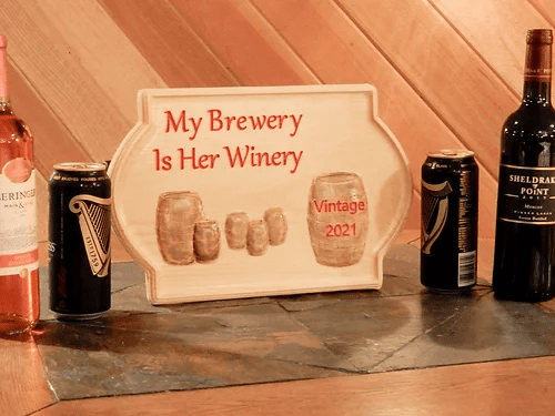 My Brewery is Her Winery says it all. Perfect for your rec area or party room. This carving measures 14" wide x 8.5" high, and is made of solid 3/4 pine. It's finished with a light oak stain followed by a clear semi-gloss sealer, and the barrels are painted to provide an old time, rustic appearance.