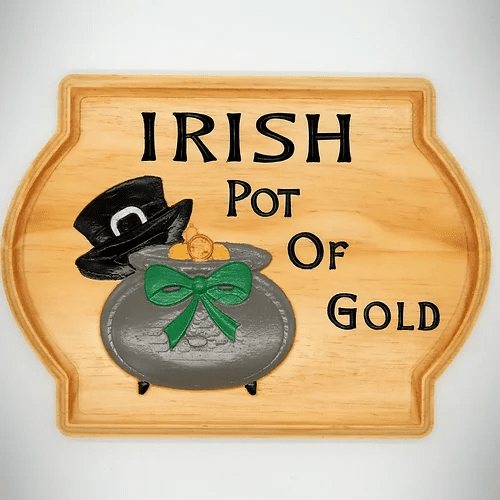The Irish Pot of Gold carving is a whimsical design, complete with an old-fashioned cauldron, gold coins an elegant Irish top hat, with a green bow to complete the picture. Made from solid 3/4 pine, it measures approximately 12.5 wide and 9.5" high, and comes with a saw-tooth hanger for easy wall mounting. This wall hanging will be the centerpiece for any room in the house and would especially look great in your entertainment or bar area. Also, this would be a great gift for your Irish friends.