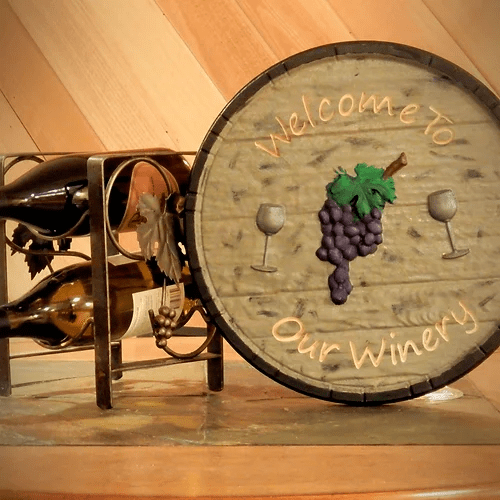 Here's a must for all you wine lovers. This design is carved into a simulated wine barrel top, with very colorful grapes, leaves and wine glasses. This 13" diameter sign can be displayed anywhere in your home, and especially in your entertainment areas. Made out of 3/4 " solid pine, with a convenient saw tooth hanger on the back. The black border nicely sets off the old-time barrel top look.